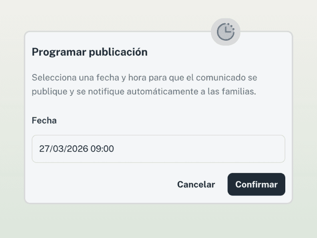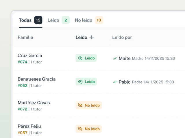 Envía comunicados o mensajes privados solo a las familias que lo necesiten. Todo desde un solo lugar y sin ruido.